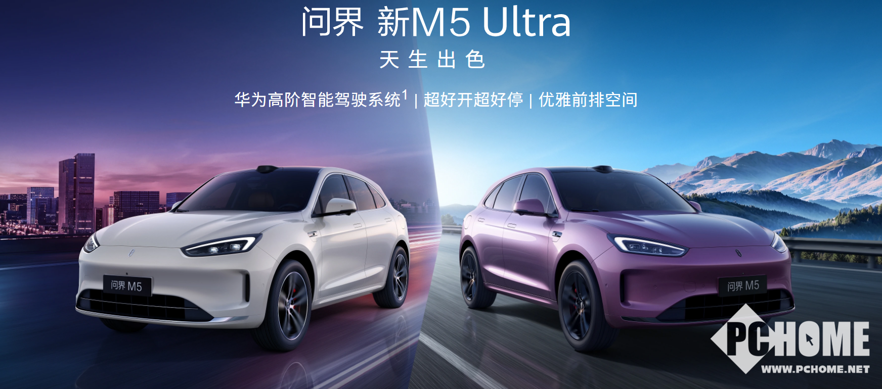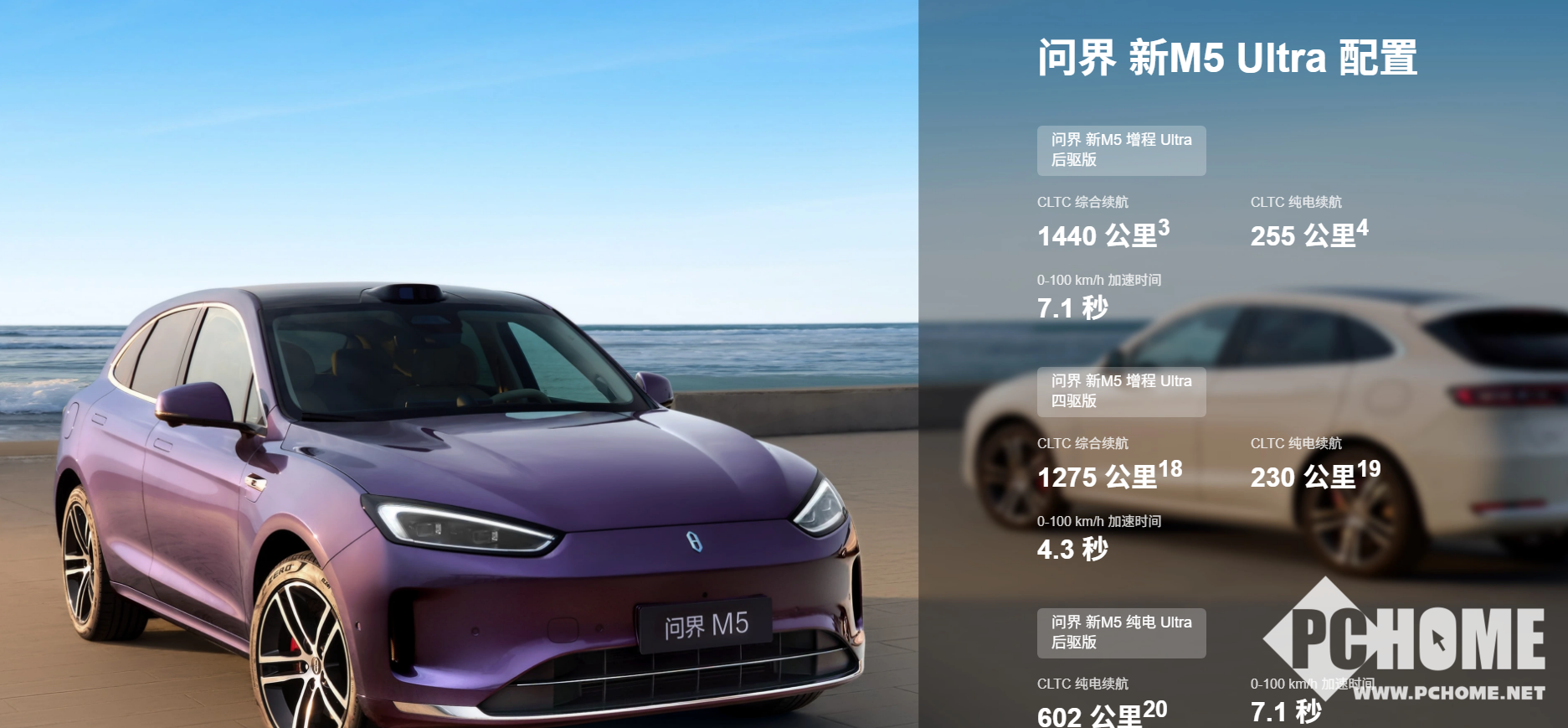 问界新M5 Ultra外观配色新增零度白、幻影紫,内饰配色新增赤茶橘,并采用怀挡设计、副驾座椅无缝四向腿托;