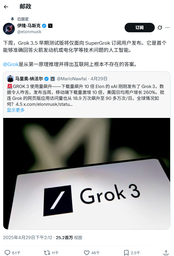 近日马斯克宣布,下周Grok 3.5的早期测试版本将面向SuperGrok订阅者发布,他表示,这将是第一个可以准确回答有关火箭发动机或电化学技术问题的AI。