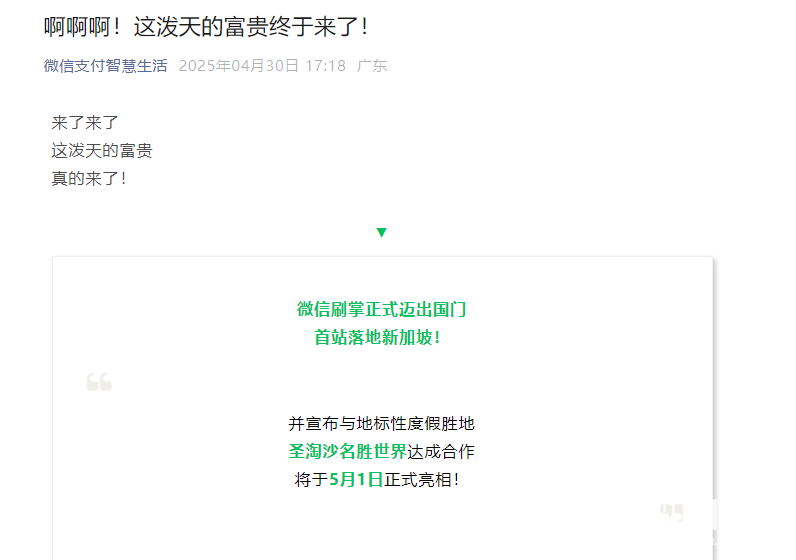 4月30日消息,微信刷掌今日官宣在新加坡开启首个海外点位,5月1日起,到新加坡圣淘沙名胜世界就能刷掌支付,包含水上探险乐园及八大消费点位,另外在境外还能用微信小程序PalmDa管理刷掌权限。