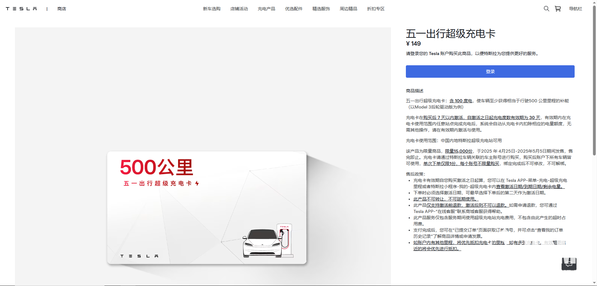 特斯拉官方表示,这张充电卡可以在特斯拉Tesla App或微信小程序里订购,限时发售,从即日起到5月5日,限量1.5万份,全国所有超级充电站都能用。