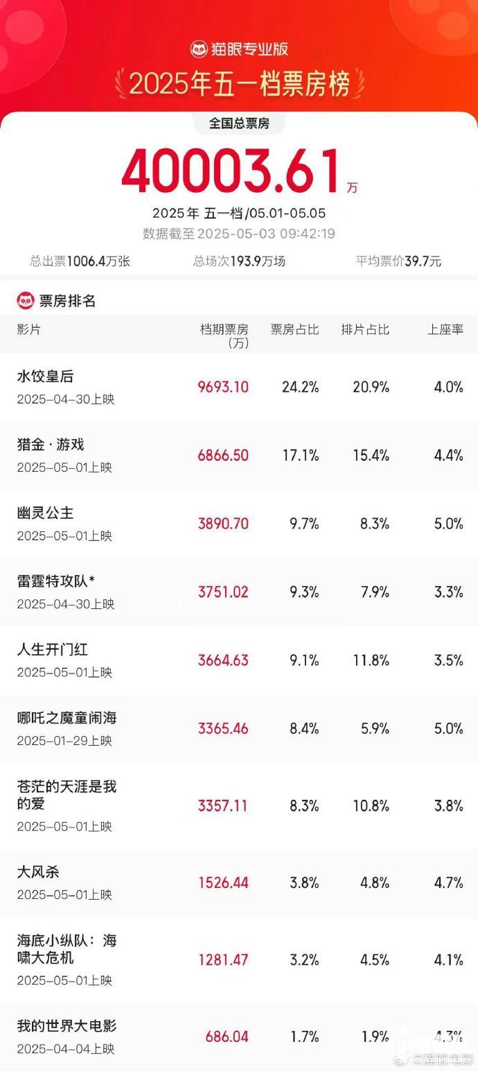 5月3日消息,据猫眼专业版数据显示,2025年五一档总票房(含预售)破4亿,电影《水饺皇后》《猎金·游戏》《幽灵公主》分列档期票房榜前三位。
