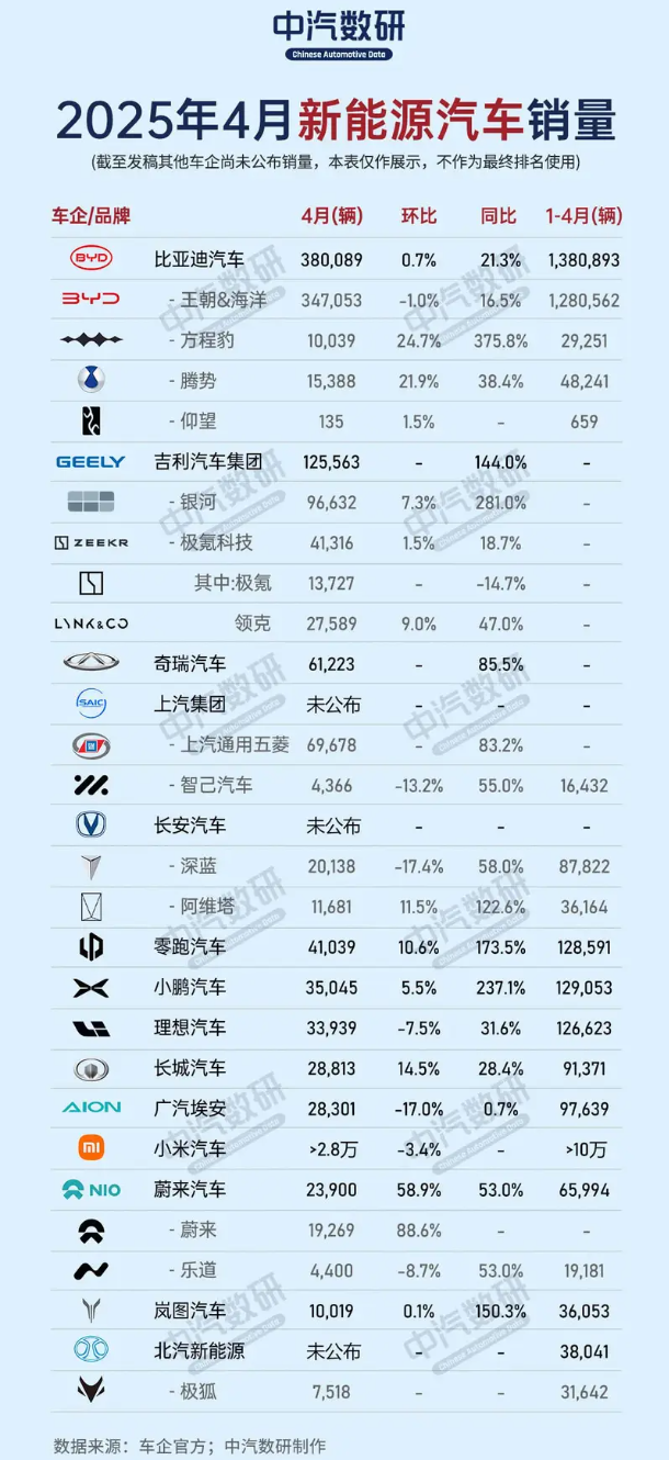5月3日消息,五一期间各家主机厂商公布2025年4月销量情况,据中汽数研数据显示,传统车企中比亚迪、吉利销量领先,在新势力品牌中,零跑排名第一,小鹏汽车和理想汽车位列二、三位。