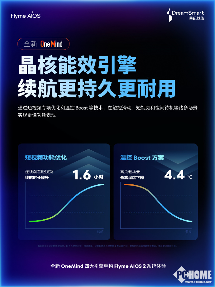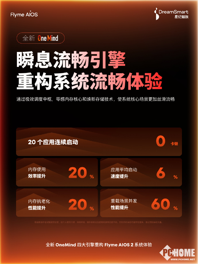 全新的OneMind四大引擎是Flyme AIOS 2系统的核心亮点。瞬息流畅引擎通过极效调度中枢、零感内存核心和焕新存储技术,让系统核心场景更加丝滑流畅,20个应用连续启动0卡顿,内存使用效率、抗老化能力和性能均提升20%。