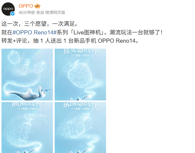 OPPO官方今天发文公布了OPPO Reno14系列海报,官方称其为“Live图神机,三个愿望一次满足”,据了解,该机型将于5月15日在珠海正式发布。