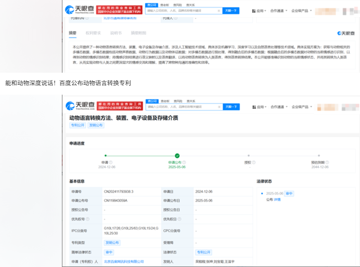 天眼查显示,北京百度网讯科技有限公司申请的“动物语言转换方法、装置、电子设备及存储介质“专利正式公布,包括机器学习、深度学习和自然语言处理技术等,这一技术通过识别动物的行为、声音、体征数据来全面反映动物的情感状态,并将其转化为人类理解的语言,从而实现人类与动物的深层沟通与交流。该技术的创新之处就在于情感识别与语言翻译。