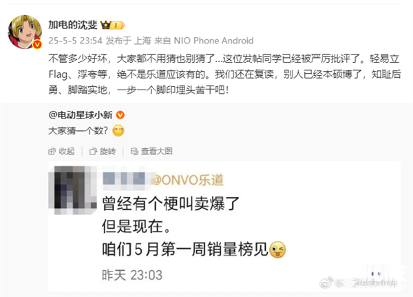 蔚来高级副总裁兼乐道汽车总裁沈斐表示,该发帖同学已被严厉批评,指出轻易立Flag、浮夸等行为绝不是乐道应有的态度。他还以“我们还在复读,别人已经本硕博了”来警醒,呼吁大家知耻后勇、脚踏实地,一步一个脚印埋头苦干。