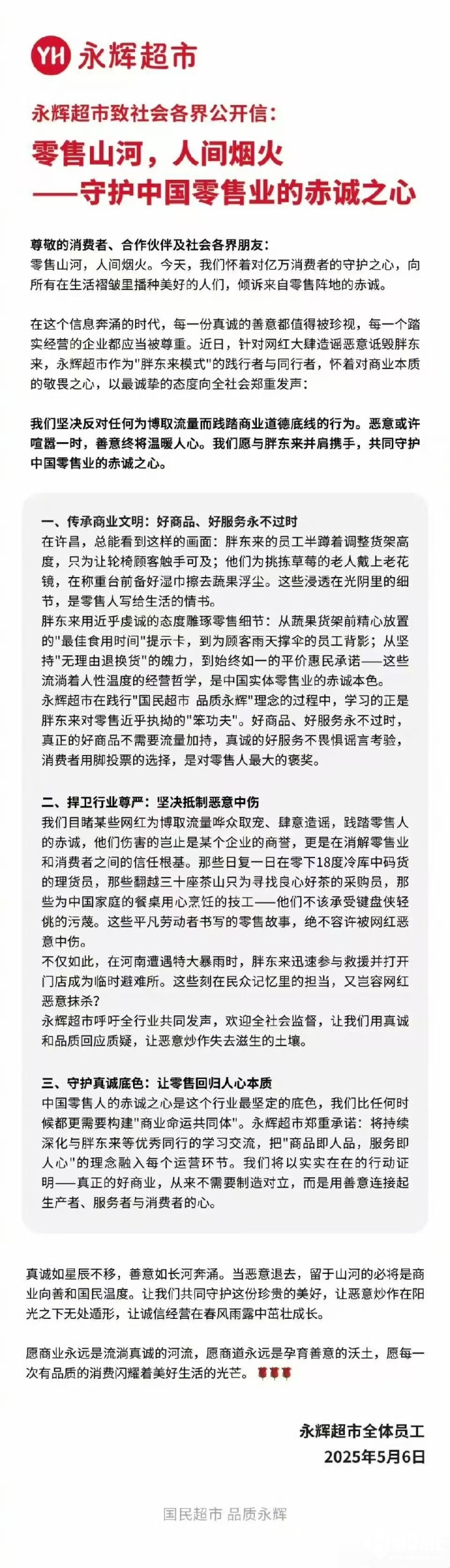 今日,永辉超市发布了一份主题为《零售山河,人间烟火——守护中国零售业的赤诚之心》的致社会各界公开信,称永辉愿与胖东来并肩携手,共同守护中国零售业的赤诚之心。