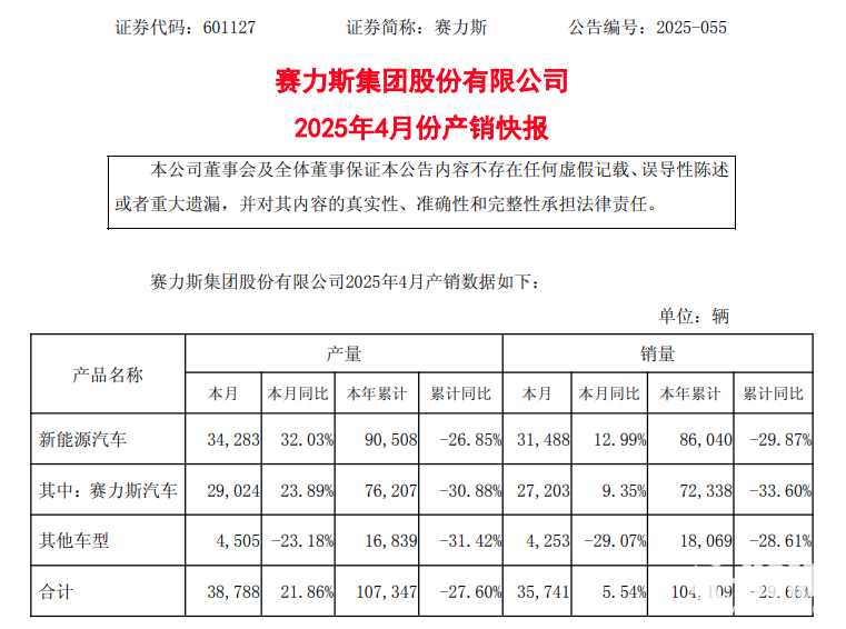 2025年5月6日,赛力斯发布2025年4月产销快报。数据显示,4月赛力斯新能源汽车销量达31488辆,同比增长12.99%;今年累计新能源汽车销量为86040辆,同比下降29.87%。赛力斯集团4月汽车合计销量35741辆,同比增长5.54%;今年累计销量104109辆,同比下降29.66%。