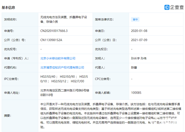 随着科技的发展,手机充电的方式也越来越多了,例如超级快充、超高刷以及无线充电等。今日,北京小米移动软件有限公司于今日公开了一项“无线充电方法及装置、折叠屏电子设备、存储介质”的专利,公开号为CN113098152A,申请日期2020年1月8日。