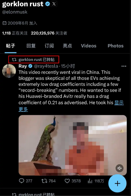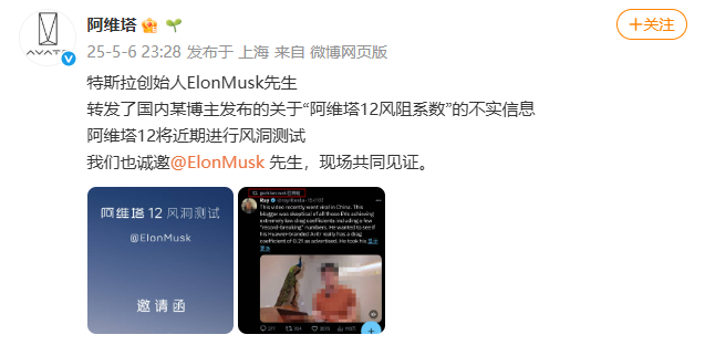 5月6日深夜,阿维塔官方帐号发文,特斯拉创始人马斯克Elon Musk先生,转发国内某博主发布的关于“阿维塔12风阻系数”的不实信息,阿维塔12将近期进行风洞测试,诚邀马斯克现场共同见证。