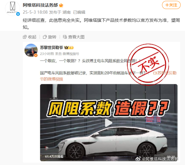 据媒体报道,阿维塔12“风阻系数造假”风波,是因为有国内博主发布视频称,国产电车风阻系数“屡破纪录”,但实测发现“和 20 年前燃油车水平一样”。随后5月3日,阿维塔科技法务部发文回应:“经详细巡查,此信息完全失实。