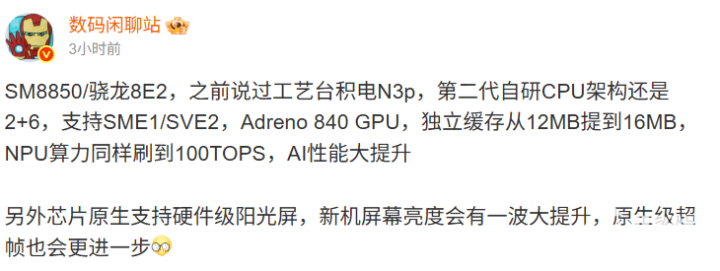高通骁龙8 Elite 2采用台积电N3p工艺打造,是台积电第三代3nm工艺制程,在相同功耗下,N3P制程能提高4%性能,在相同主频下,其功耗降低9%,整体晶体管密度提高了4%。集成Adreno 840 GPU,独立缓存从12MB提升到16MB,并且NPU算力也从80TOPS提升到了100TOPS,AI性能大幅提升。