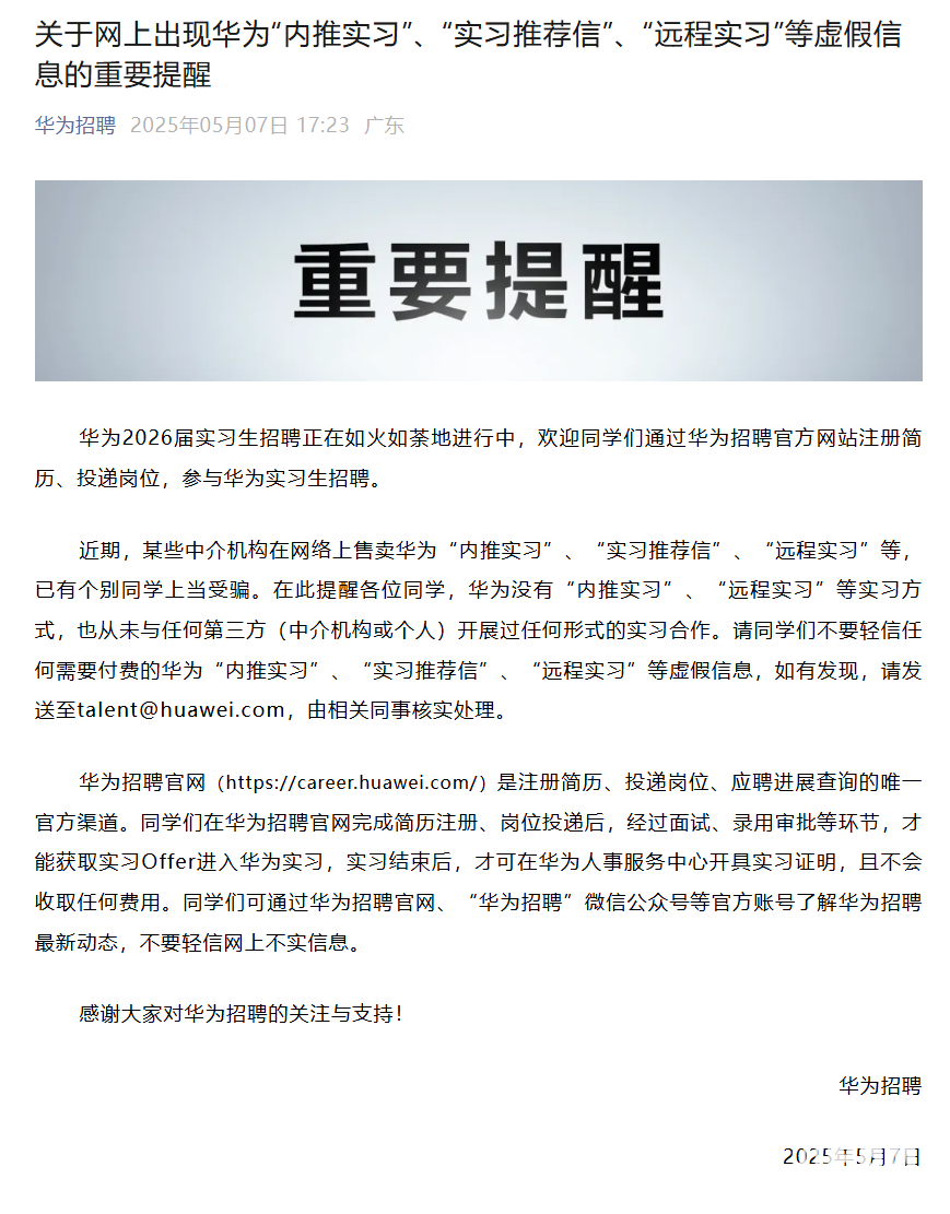 2025年5月8日消息,近日“华为招聘”官方账号发文提醒,近期某些中介机构在网络上售卖华为“内推实习”“实习推荐信”“远程实习”等,已有个别同学上当受骗。在此提醒各位同学,华为没有“内推实习”“远程实习”等实习方式,也从未与任何第三方(中介机构或个人)开展过任何形式的实习合作。