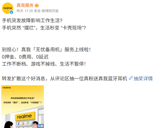 昨日realme真我服务宣布“无忧备用机”服务上线,0押金0费用0延迟,提供线上申请、到店领取两种方式。