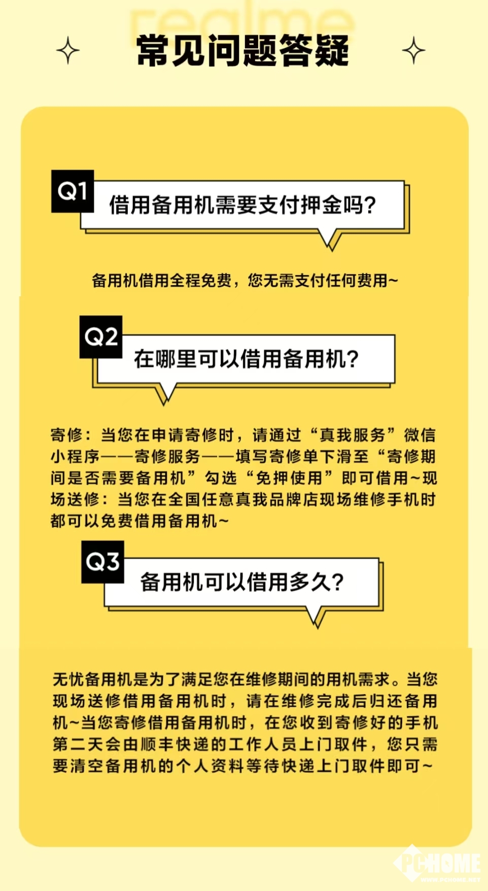 到店领取:前往全国任意真我品牌店即可领取备用机,维修完成后归还备用机(记得提前清空备用机个人资料)至门店或邮寄回指定地址,备用机借用/归还双向顺丰免邮。