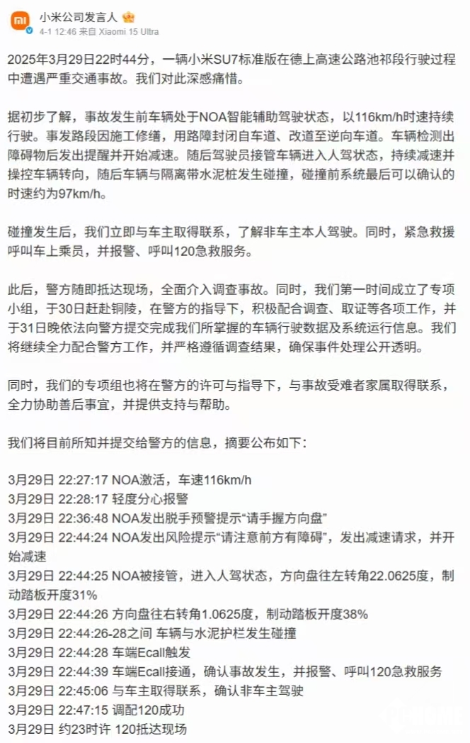 2025年3月29日发生了一起交通事故引发巨大关注。一辆小米SU7标准版与道路隔离带水泥桩发生剧烈碰撞后起火,车内三名年轻乘客不幸遇难。小米表示,司机在高速以每小时116公里的速度行驶时,启用了该公司的“NOA智能辅助驾驶状态”,汽车在以这样的速度行驶时遇到了一个路障,因为部分道路正在维修,车辆被分流到另一条车道上。碰撞前几秒,汽车警告前方有障碍物,并开始减速,但为时已晚。