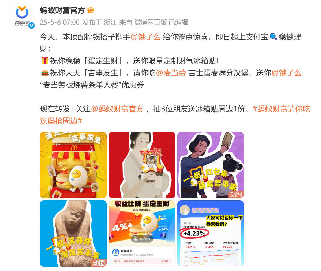 2025年5月8日消息,“蚂蚁财富请你吃汉堡抢周边”话题冲上热搜榜,蚂蚁财富和麦当劳、饿了么携手联动,上支付宝搜“稳健理财”参与活动,就有机会领麦当劳吉士蛋堡和限定款财气周边。