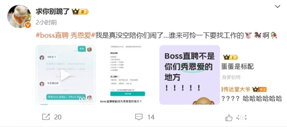 今日,一条“Boss直聘秀恩爱”的词条冲上热搜,Boss直聘官方客服回应媒体称,“您反馈的问题已经收到,我们会有专员来处理此事”。
