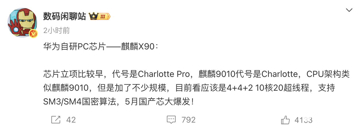 近日,知名数码博主“数码闲聊站”爆料称,鸿蒙电脑首发华为自研PC芯片麒麟X90,该芯片立项比较早,代号为Charlotte Pro,麒麟9010代号是Charlotte,CPU架构类似麒麟9010,但加了不少规模,目前看应该是4+4+2 10核20超线程,支持SM3/SM4国密算法。