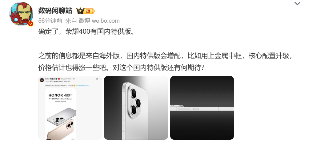昨天荣耀数字系列最新产品HONOR 400系列海外版正式官宣,官方释放了产品ID图,据科技博主爆料,确定面向国内市场也将推出荣耀400系列新品,国内版本将在海外版基础上,升级配置,机身材质或使用金属中框,售价可能上涨。
