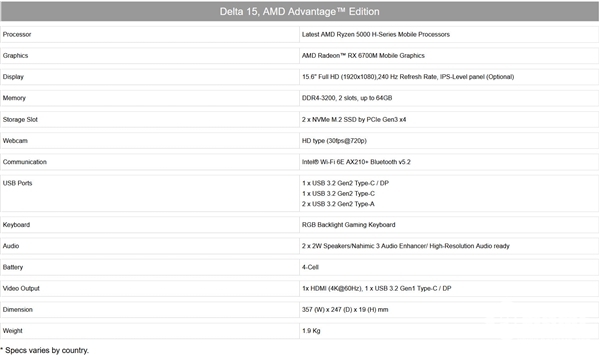 Delta 15则是微星全新开辟的锐龙游戏本,也是最轻薄的锐龙本之一,厚度仅为19.9mm,重量不过1.9kg,但配备了锐龙9 5900H、RX 6700M的高级组合,后者拥有2307个流处理器、80MB无限缓存、10GB GDDR6显存,适合2K游戏。