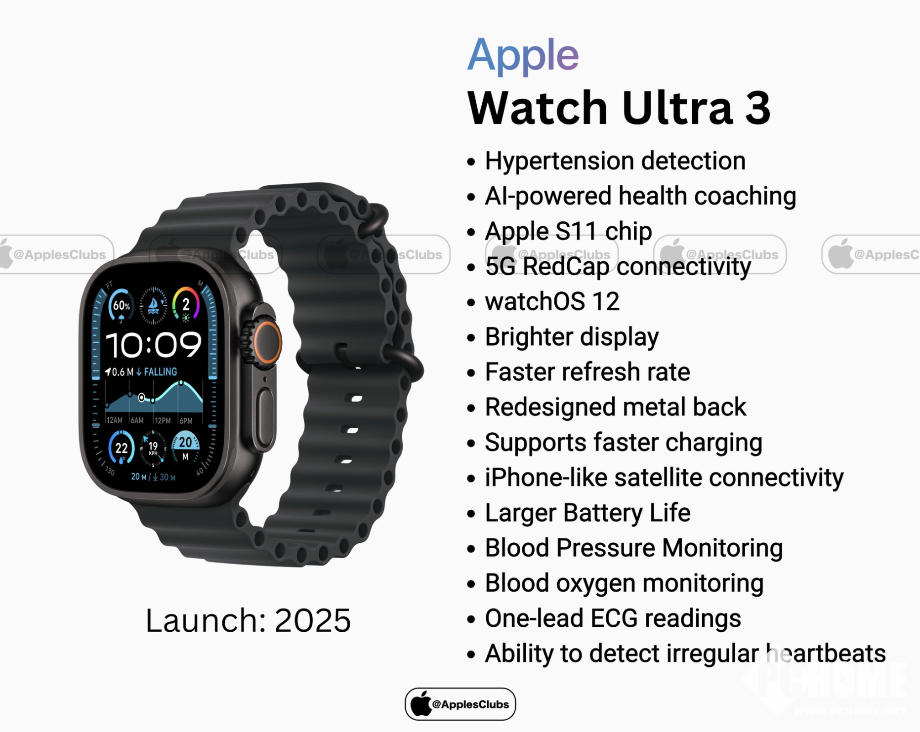 配置方面,Apple Watch Ultra 3亮点十足。它首次搭载5G RedCap连接技术,在带来更快网络速度的同时,有效平衡功耗,保障使用体验。性能上,配备Apple S11芯片,运行watchOS 12系统,操作流畅度和功能拓展性值得期待。 健康监测功能进一步升级,新增高血压检测,还具备AI健康指导,结合已有的血氧监测、单导联心电图读取、不规则心跳检测等功能,为用户健康保驾护航。