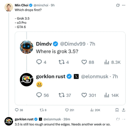 近日,有网友在社交平台问到:“Grok 3.5、GPT-4o Pro、GTA 6,哪个会更早发布?”,xAI创始人埃隆·马斯克回应:“Grok 3.5还需要一周左右的时间打磨,现在还是有点太粗糙了。”