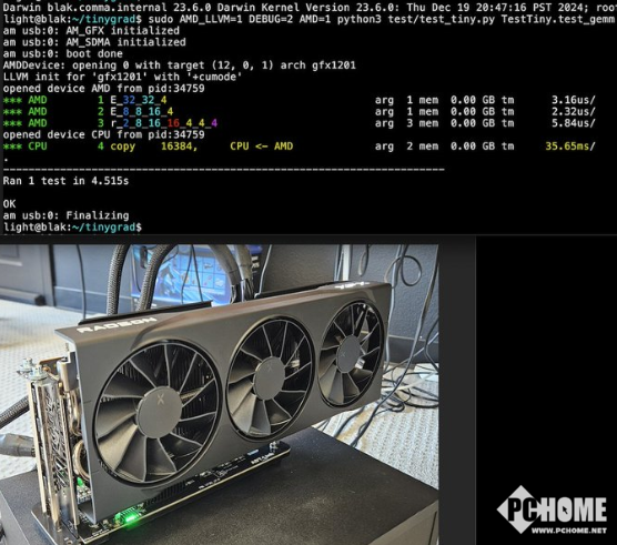 为了在苹果平台上实现USB 3外置显卡,Tiny Corp使用了ADT-UT3G扩展坞,主控芯片是祥硕ASM2464PD,它默认仅支持雷电3/4、USB4,因此用了定制固件实现USB 3模式,可以在PCIe/USB 3之间翻译指令,不需要直接走PCIe;显卡用的是AMD RX 9070 XT,这是因为驱动的限制,只能搭配RX 7000/9000系列,未来可能也会支持RX 5000系列,但因为走的是USB3,带宽只有10Gbps,实际性能大打折扣;