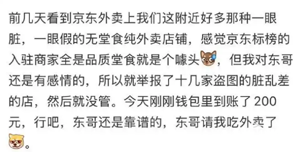 近日有网友爆料在京东外卖上看到很多无堂食纯外卖店铺,感觉京东标榜的入驻商家全是品质堂食就是个噱头,由于对京东还有感情,于是网友举报了十几家存在盗图问题的脏乱差店铺,但是没有想到,网友发现近日钱包突然到账200元。