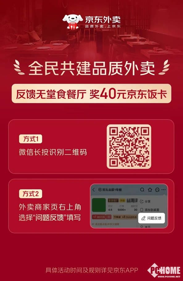 京东诚邀全民监督,发现不符合标准的 “无堂食餐厅” 混入京东外卖,用户可通过扫描二维码或通过商家门店页右上角 “问题反馈” 入口进行反馈,在核实下线后,反馈用户可获得40元京东饭卡作为答谢。