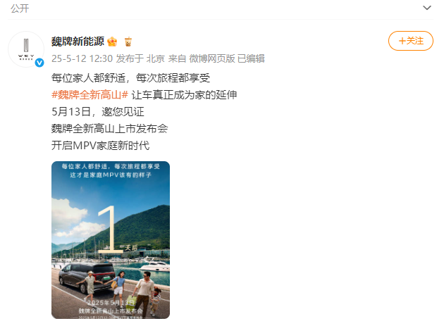 5月12日消息,长城旗下魏牌新能源今日在社交平台公布,魏牌全新高山上市发布会将于5月13日正式举行。