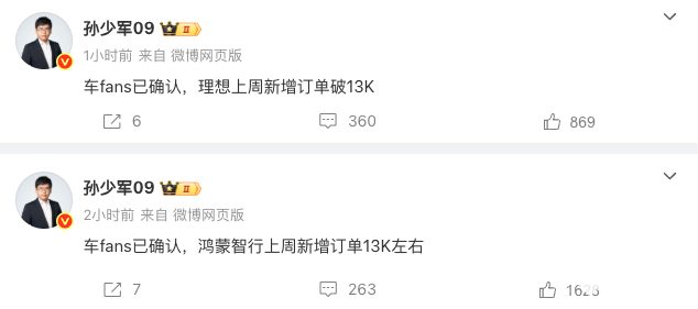 5月12日消息,据博主@孙少军09消息,车fans已确认,理想上周新增订单量破13k,而鸿蒙智行四品牌上周新增订单量总共为13k左右,理想单一品牌销量与鸿蒙智行四品牌总销量齐肩。