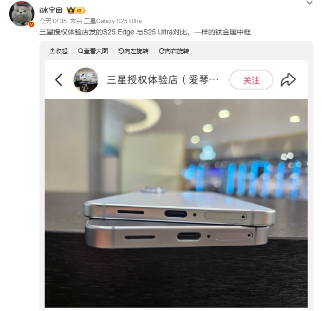 今天,在社交平台上,也有三星体验店帐号疑似曝光了星Galaxy S25 Edge真机的对比照。
