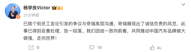 吉利副总裁杨学良对此事作出回应,表示已就个别员工言论引发的争议与奇瑞高层沟通。他还称赞奇瑞展现出诚信负责的风范,并宣布此事已得到妥善处理,告一段落。