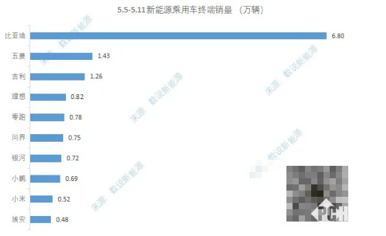 5月13日消息,最新一周(5.5至5.11)新能源乘用车终端销量已公布,比亚迪6.8万辆稳居第一,理想8千辆位列第四,小米排名居倒数第二。