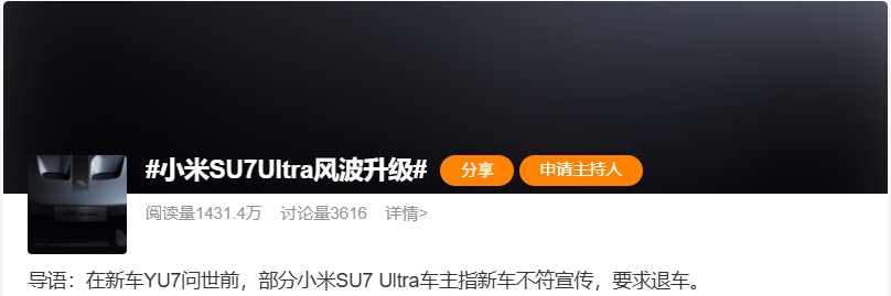 据了解,近日数百名小米SU7Ultra车主因宣传和实际不符要求退车,喊话雷军“保持真诚”,小米SU7 Ultra风波升级,5月7日,小米汽车发布致歉声明,对于挖孔相关争议,称此前信息表达不够清晰,并采取补偿措施。