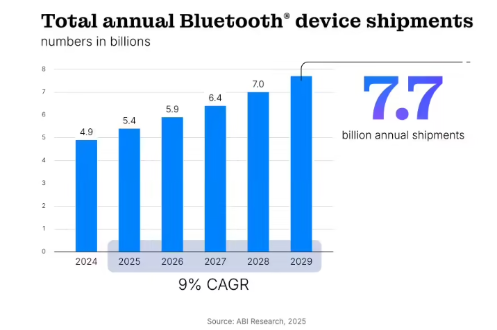 近日蓝牙技术联盟Bluetooth SIG最新发布《2025市场更新》报告,预估蓝牙技术在2025年将迎来爆发期,全球设备出货量预计超过54亿台,并有望在2029年攀升至77亿台,五年复合增长率为9%。