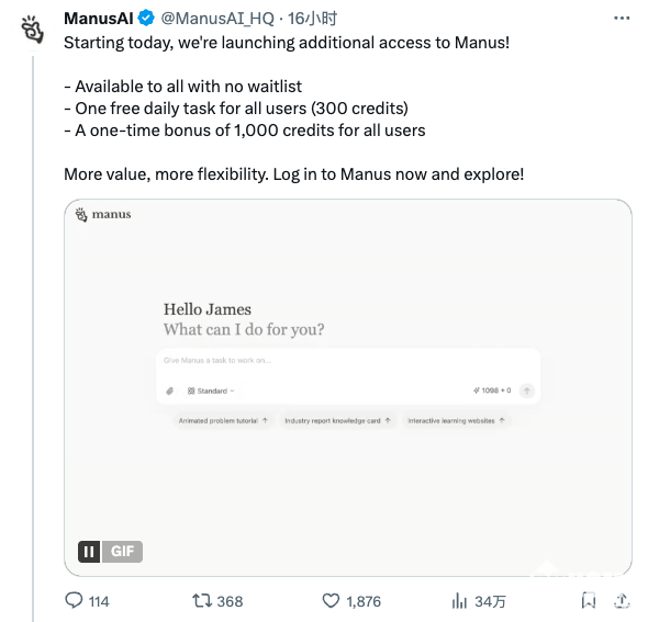 2025年5月13日,AI应用平台Manus通过官方账号宣布正式开放注册,所有用户无需等待名单即可使用。同时,Manus推出多项用户福利,包括每天可免费使用一项任务(相当于300积分)以及一次性赠送1000积分,吸引更多用户上手体验。