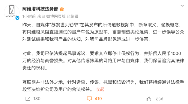 阿维塔法务表示,“苏黎世贝勒爷”在其发布的所谓道歉视频中,断章取义,偷换概念,将阿维塔风阻直播测试的量产车说成原型车,蓄意制造舆论混淆,进一步误导公众对测试结果和该司产品的认知,对阿维塔品牌形象造成进一步侵害。对此,阿维塔已依法提起民事诉讼,要求其立即停止侵权行为,并赔偿人民币1000万的经济与商誉损失。