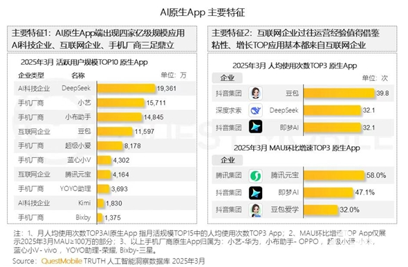 据QuestMobile数据显示,截止到2025年3月份,移动端AI原生App月度活跃用户规模为5.91亿。其中由六大手机厂商主导的AI原生应用异军突起,以4.81亿月活规模构筑起行业竞争新壁垒。