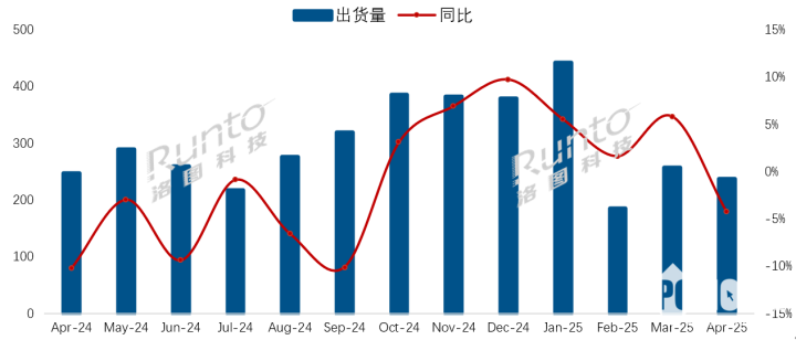 2025年5月13日消息,据洛图科技RUNTO发布数据显示,2025年4月,中国电视市场品牌整机出货量为236.5万台,同比下降4.3%,自去年10月“国补”见效以来,在经历了连续6个月的出货量同比增长之后,首次出现下降,并且环比数据也下降8.0%。
