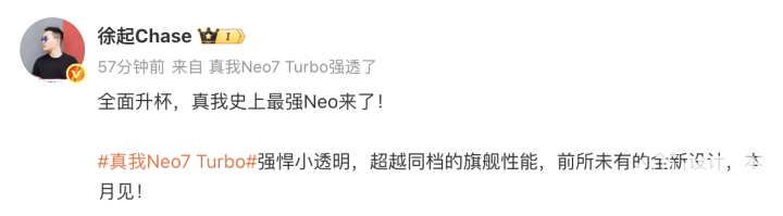 对此,真我realme副总裁、全球营销总裁、中国区总裁徐起在社交媒体平台表示,真我Neo7 Turbo拥有“超越同档的旗舰性能,前所未有的全新设计”。