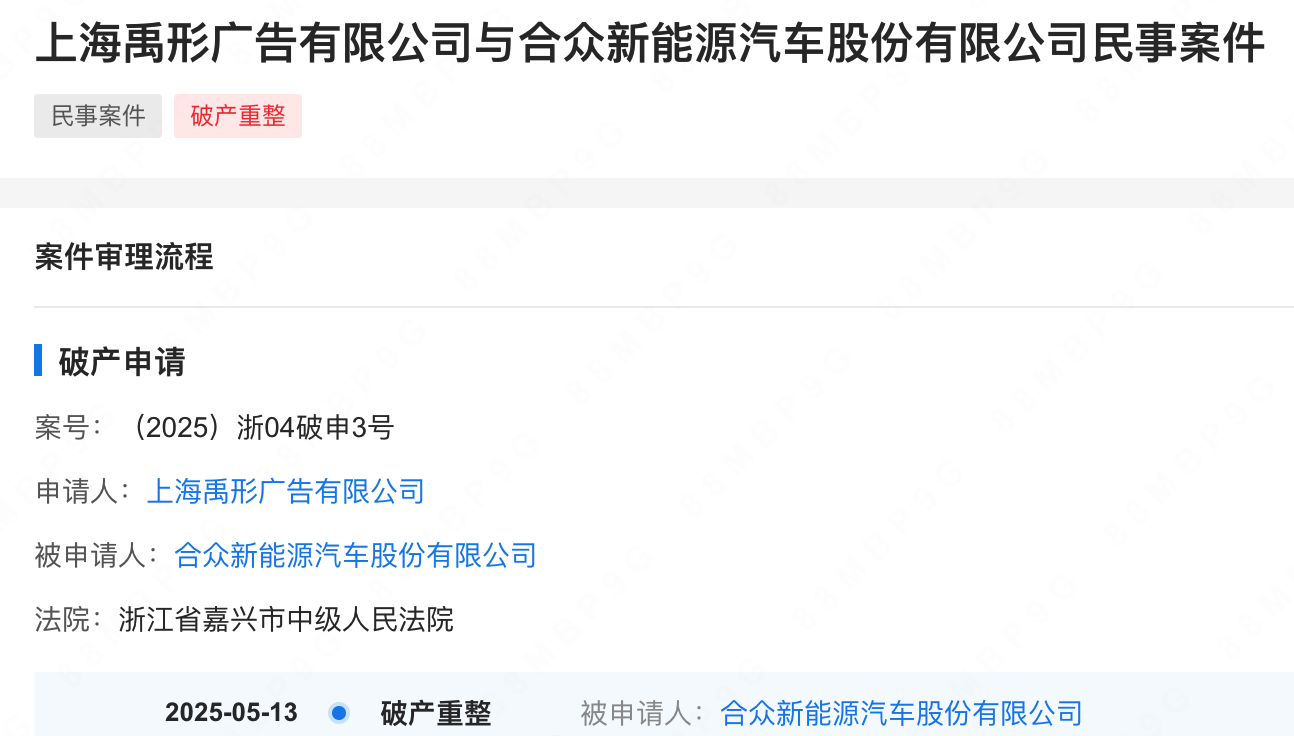 2025年5月14日消息,据中新经纬报道,全国企业破产重整案件信息网显示,5月13日,哪吒汽车母公司合众新能源汽车股份有限公司,新增破产审查案件,申请人为上海禹形广告有限公司,办理法院为浙江省嘉兴市中级人民法院。
