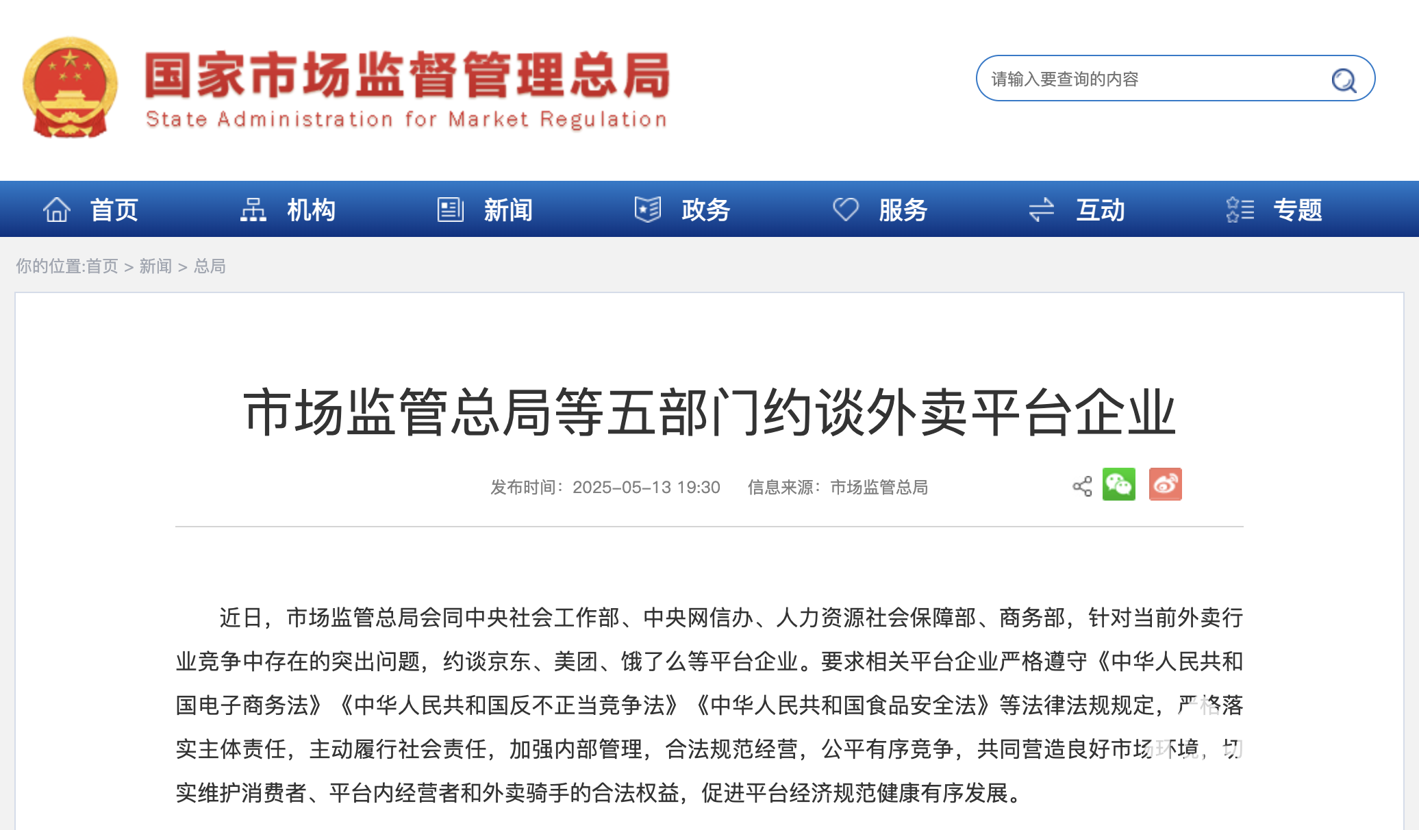 近日,市场监管总局会同有关部门,针对当前外卖行业竞争中存在的突出问题,约谈了京东、美团、饿了么等平台企业。