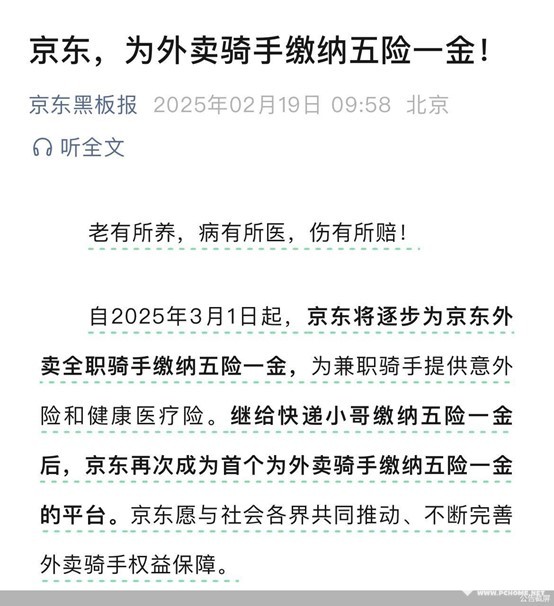 京东在社交平台发布声明,宣布为骑手上五险一金,优先为骑手家属提供岗位等福利待遇。在这之后,美团也宣布,预计在2025年第二季度,逐步为全职与兼职骑手缴纳社保,提供意外险。早在2023年,饿了么就启动社保缴纳试点,推进“新职伤”保险覆盖。今年2月20日,饿了么再次发文称,平台目前已改善骑手用餐、劳动保护、生活福利等工作待遇。