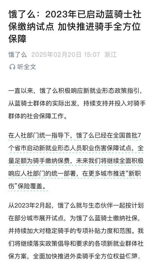 2025年2月,饿了么发布《2023已启动蓝骑士社保缴纳试点,加快推进骑手全方位保障》一文,按计划在部分城市展开试点,为饿了么蓝骑士缴纳社保,并持续加大对稳定骑手的专项补贴力度和范围。2年过去,如今还在试点中,骑手们的等待是否会遥遥无期。