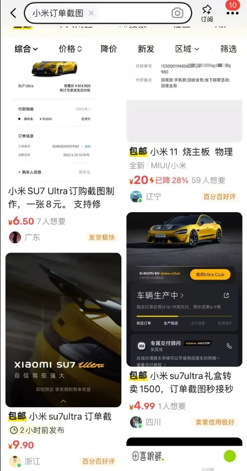 据悉,电商平台还有商家提供小米SU7 Ultra订单制作服务,为顾客量身定做,可以修改订单时间、订单编号、尾款支付方式、交付时间、创建时间等。还有商家介绍页面称,提供小米汽车SU7 Ultra订单截图,全天随时更新、实时截图,保证让你装到位,一次拍下永久使用。