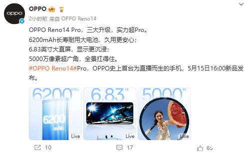 OPPO Reno14系列手机已定档5月15日16:00发布,新机将预装ColorOS 15系统,支持4K视频转实况照片等功能。此外,还公布了Reno14 Pro手机在电池,屏幕,像素三方面的升级。