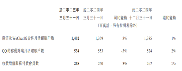 腾讯控股公布了2025年第一季度财报:公司第一季度营收1800.2亿元人民币,同比增长4%,微信及WeChat合并月活跃用户数达14.02亿,同比增长3%,环比增长1%,QQ移动终端月活跃用户数5.34亿,同比减少3%,环比增长2%。