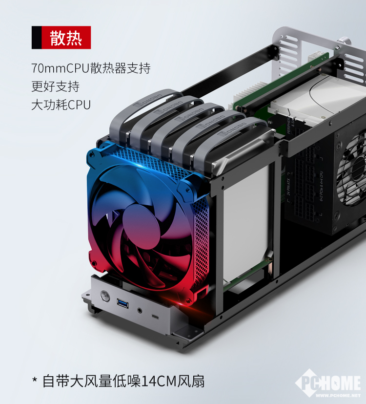 机箱还可以安装高度不超过70mm的CPU散热器,以及长度不超过150mm的SFX电源。另外标配了一个140mm散热风扇,结合两个面的通风孔加强散热。前面板除了二合一音频接口和USB 3.0接口,还配置了一个USB Type-C接口。